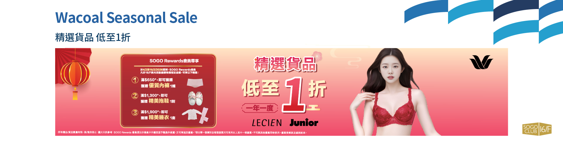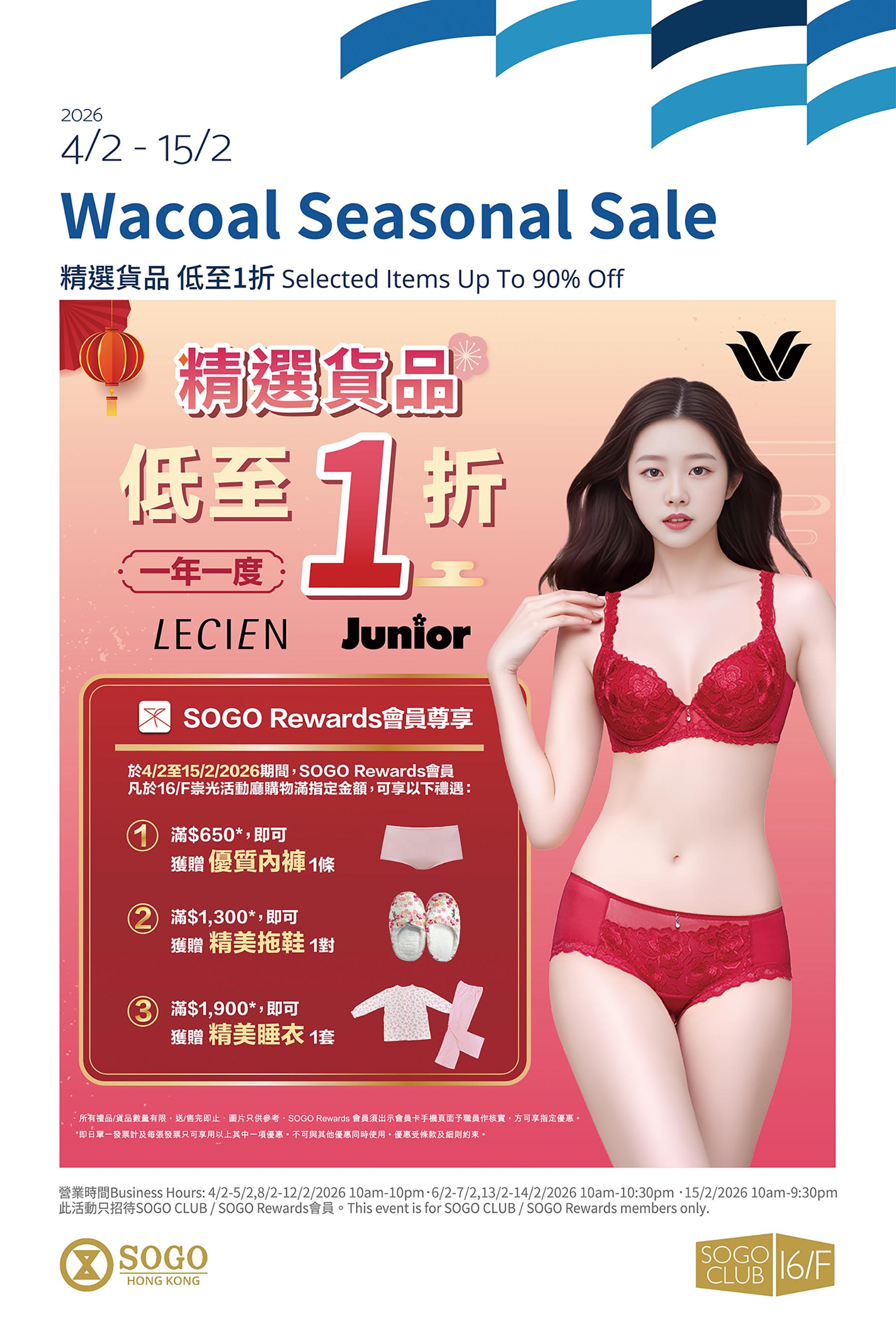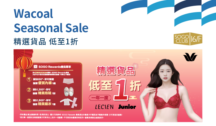於4/2至15/2/2026期間,Wacoal Seasonal Sale於崇光銅鑼灣店SOGO CLUB 16/F舉行,歡迎親臨選購貨品。
