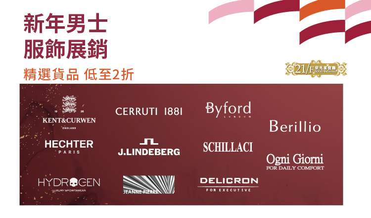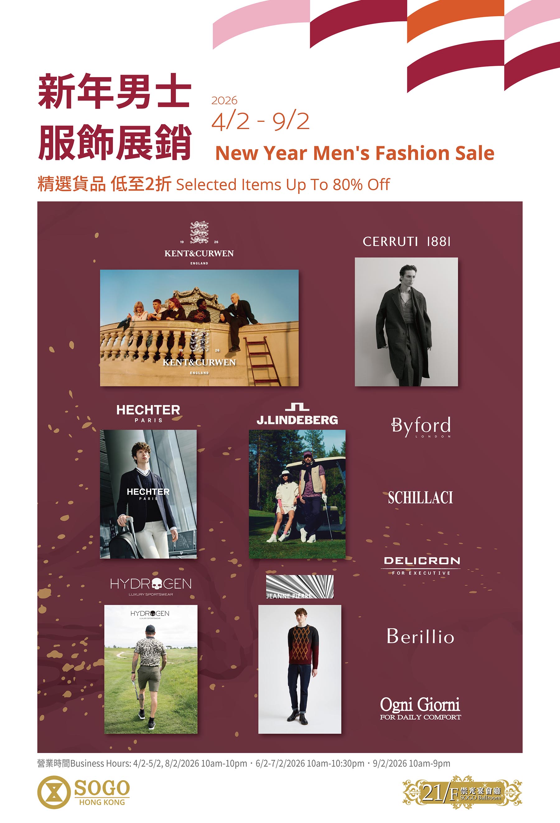 於由4/2/2026至9/2/2026期間,新年男士服飾展銷於崇光銅鑼灣店21/F崇光宴會廳舉行,歡迎親臨選購精選貨品,尊享低至2折優惠。