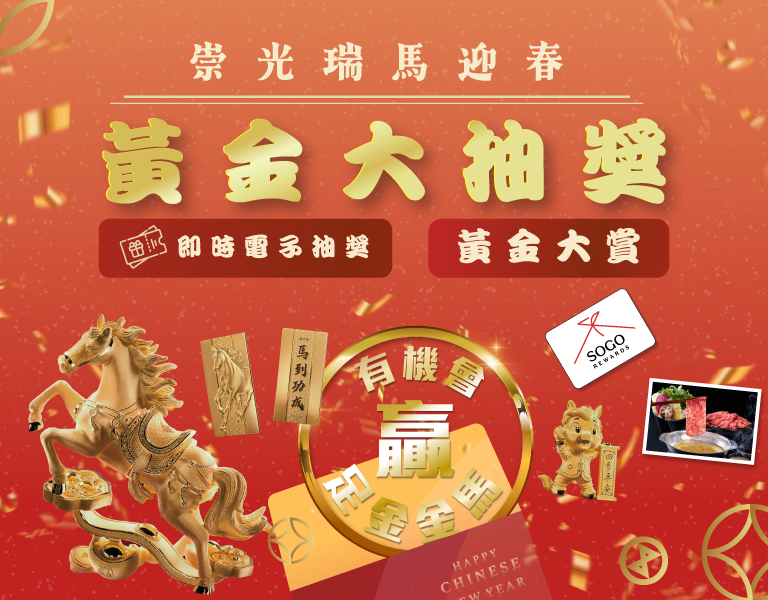 於4/2至24/2/2026期間,SOGO Rewards會員凡於崇光銅鑼灣店或啟德店單一購物滿指定金額(不包括崇光購物禮券),即可獲《崇光瑞馬迎春黃金大抽獎》雙重中獎機會,有機會贏取豐富禮品。